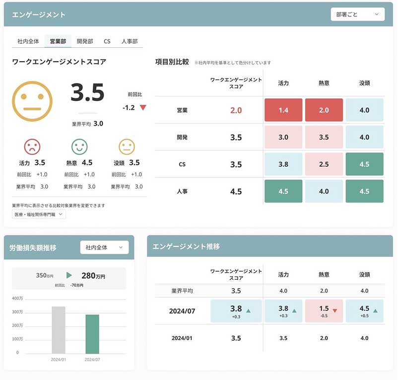 医療専門家・産業医・経営者の監修のもと開発したオリジナルシステムにより、各種指標を数値として可視化します。従業員の健康状態やワークエンゲージメントに加え、それらの状態によって発生する労働損失額についても算出します。
