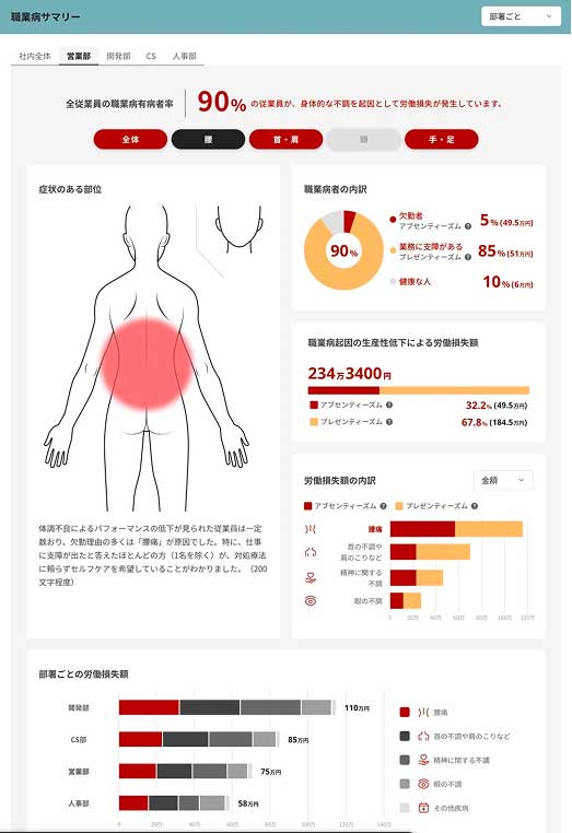 システムを利用することで、不調による身体への負担を数値化し、それに伴う損失額も算出します。- アンケート、労働損失額の可視化